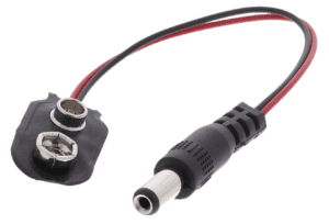 Die Batterieklemme wird direkt auf einen 9V-Block gesteckt. Über die offenen Kabelenden kann sie flexibel in die Elektronik eingebunden werden.