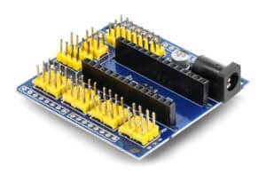 Das I/O-Expansionboard macht den Anschluss von Bauteilen deutlich einfacher. Der Arduino Nano wird aufgesteckt und alle Ein- und Ausgänge sind übersichtlich als Steckleisten herausgeführt. So lassen sich Sensoren, Motorsteuerung und weitere Module sauber und ohne Kabelsalat mit dem Roboter verbinden.